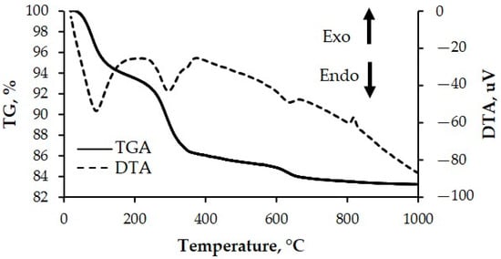 The thermal stability of the NMW was studied from the characteristic TG-DTA thermograms presented in Figure 3. It can be seen that the total mass loss of the NMW silt is 16.75%. The DTA pattern shows four regions of DTA peaks, three of which correspond to endothermic reactions and one corresponds to exothermic reaction. The first region shows an endothermic peak at 91.10 °C with mass loss of 4.95%, which can be attributed to the elimination of free water based on the TG curve. The second region presents another endothermic peak at 295.34 °C with 7.79% mass loss, which is caused by the removal of crystal water. The third region is another endothermic reaction at 637.54 °C with mass loss of 2.95%, which indicates the loss of hydroxyl group. The last region is an exothermic reaction at 818.32 °C with 1.06% mass loss due to the decomposition of silicate such as montmorillonite and lizardite [30,31,32].