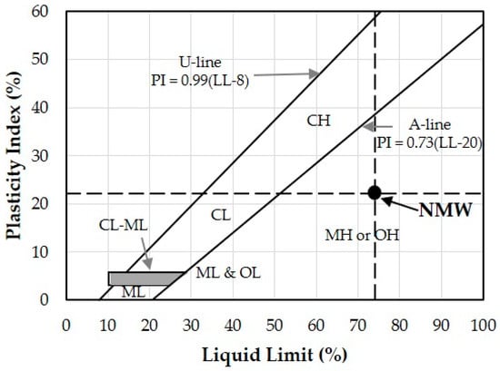 Plasticity Index and Liquid Limit of NMW on the Plasticity chart [34].