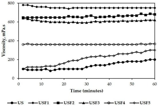 Five formulations were prepared for the evaluation of NMW for ceramic tiles as shown in Table 4. US contains 100% NMW for tile production. Formulations USF1 to USF5 contain decreasing amounts of NMW added with feldspar. To simulate the stability of slip during slip casting, the viscosity of slips with respect to time at continuous stirring mode under a given constant shear rate was determined. The stirring rate was set to 100 rpm (14.2 s−1) for pure NMW slip and 30 rpm (21.4 s−1) for NMW formulated slips. Initial study shows a high stirring rate of 100 rpm for the pure nickel laterite mine waste was found to be stable inorder for its viscosity to be determined by the viscometer. However, the viscosity of formulated slips can already be detected even at low intensities of agitation or low stirring rate at 30 rpm. As shown in Figure 5, the viscosity of the formulated slips decreases with decreasing NMW content in the formulation. Most formulated slips showed a slightly stable viscosity over time such as USF1, USF2, USF3 and USF4 except for USF5, which exhibits rheopectic behavior. Rheopectic behavior is the condition where a slight increase in viscosity over time (shear thickening) is observed even under an imposed constant shearing action. During the continued stirring of USF5 slip, a preferential buildup of structure in the micron sized particles was observed, and shear-induced crystallization may be responsible for this behavior [36]. However, despite the slight increase in the viscosity of USF5 over time, it exhibits the lowest viscosity among the formulated slips. Moreover, USF4 exhibits the most stable viscosity and shows only a slightly higher viscosity than that of USF5 within 60 min of continuous stirring. This indicates that both USF4 and USF5 may require only low energy for continuous stirring requirements to maintain its fluidity during casting.