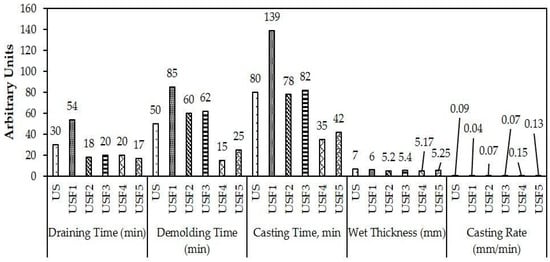 A comparison of the draining time, demolding time, casting time, wet thickness and casting rate of the pure NMW slip and the different formulations of slips is presented in Figure 6. Both pure and formulated slips yielded wet cast thickness ranging from 5.17 to 7 mm, which indicate that they can be casted to produce tiles with a range of thickness between 10 and 14 mm. The casting rate estimates are close to each other but cannot be used to determine which slips are best for tile casting. However, among the five formulations, USF4 and USF5 exhibit the shortest draining, demolding and casting time, at least 35 min, for casting a 10 mm thick tile. For a 14 mm thick tile, casting took 80–125 min, which means that casting a 10 mm thick tile is more favorably economical.