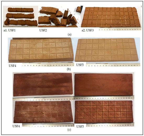 Physical and mechanical characterization of the ceramic tiles used test bars produced from the different slip formulations. USF1 and USF2, which were characterized by a high casting time, obtained flabby casts, which resulted in hollow rather than solid test bars. Cracks were easily induced on the casts during demolding, as shown in Figure 7(a1). Hence, high casting time does not really guarantee good casts. USF3 on the other hand produced a slightly flabby cast wherein the test bars were still formed; however, it generally failed in the casting of larger tiles due to the formation of cracks during demolding as shown in Figure 7(a2). The flabby casts obtained from the casting of USF1, USF2 and USF3 are consistent with their high viscosity results. Hence, no data were obtained further for the physical properties of USF1, USF2 and USF3. Successful casting and firing at 1050 °C of ceramic tiles, as shown in Figure 7c, were obtained from USF4 and USF5, which have both relatively low NMW content.