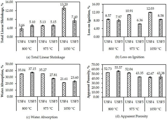 The average results of the total linear shrinkage, loss on ignition, water adsorption and apparent porosity of the tiles produced from USF4 and USF5 at three different firing temperatures are presented in Figure 8. The total shrinkage is generally lower at low temperatures, as shown in Figure 8a. These values of total shrinkage are necessary to forecast the desired size of the fired tiles during the making of the plaster mold for casting tiles. Usually, a low value of shrinkage is favorable to achieve dimension of the wet cast tile close to the dimension of the final tile. However, other properties should be considered in choosing the best formulation. All tiles with NMW have higher shrinkage than bricks from river silt [20] and dredging sediment [37] since river silt and dredging sediment are highly siliceous while NMW has low silica content. The loss on ignition of the formulated NMW as shown in Figure 8b is lower than the mass loss obtained from TGA (16.75%). This means that the feldspar has a negligible contribution to the mass loss of the formulated fired tiles which could be attributed solely to the NMW content. Both USF4 and USF5 could have undergone initial vitrification as early as 900 °C [38], which compacted the clay matrix at high temperature (1050 °C) and aided in porosity reduction. During vitrification, liquid phases of clays and feldspars are starting to form and fill the matrix, which promote its densification and contraction of the interior structure due to the rearrangement of particles induced by capillarity and surface tension [39]. USF4 has higher flux (CaO, MgO)/silica ratio or higher (CaO, MgO) content, relative to silica, compared to USF5. CaO and MgO are typical oxides that can lower the melting point of silica, which forms into a liquid during firing. This liquid begins to fuse filling up the pore spaces in the tile matrix, which decreases porosity as well as the water absorption, due to the formation of this liquid during firing or its vitirification [40], as evident in water absorption and apparent porosity in Figure 8c,d, respectively. This is also accompanied by a higher shrinkage of USF4 than of USF5, as shown in Figure 8a. CaO and MgO are primarily contributed by feldspar and NMW, respectively. This shows the high feldspar content of both USF4 and USF5 successfully lowered both the water absorption and apparent porosity particularly at high firing temperatures (975 °C and 1050 °C). However, tiles of USF4 and USF5 fired at 1050 °C have higher water absorption, resulting in a lower MOR than the bricks with river silt [20] and tiles with dredging sediment [37].