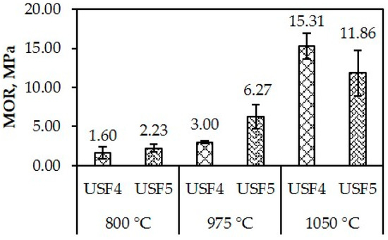 The modulus of rupture at different temperatures is presented in Figure 9. Tiles with high MOR has low water absorption and low apparent porosity. Test bars fired at 975 and 1050 °C have higher MOR values than those fired at low temperature (800 °C) [38]. This could be due to the presence of liquid phases filling the matrix formed during vitrification as early as 900 °C [38]. The lower MOR value obtained at 975 °C than at 1050 °C could be attributed to the incomplete structural transformation resulting in the heterogeneity of phases such as silica carrying spinel-type structures [38]. USF4 has higher MOR (15.31 MPa) than USF5 (11.86 MPa) when fired at 1050 °C, which concurs from USF4 having lower water absorption and lower apparent porosity than USF5. This could mean that USF4 have more solid phases than USF5 in the tile matrix resisting the applied load during MOR test prior to their fracture. In this study, the production of NMW tiles with formulation of USF4 fired at 1050 °C obtained the highest MOR of 15.31 MPa.