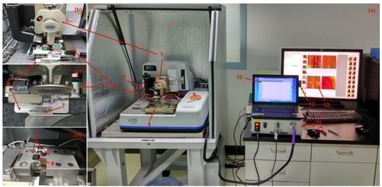 Figure 1. (a) Microdynamic loading test system (b) Enlarged view of AFM scanner and microdynamic loading device (c) Enlarged view of connection part (d) sample holder and sample; 1—Scanner, 2—Optical auxiliary system, 3—Probe clip and probe, 4—AFM sample stage, 5—Three-point bending microdynamic loading device, 6—Sliding ball base, 7—Right angle connection piece, 8—Three-point bending sample holder, 9—Sample, 10—Loading control software, 11—Loading controller, 12—Display screen of optical imaging system, 13—Figure tested by AFM.