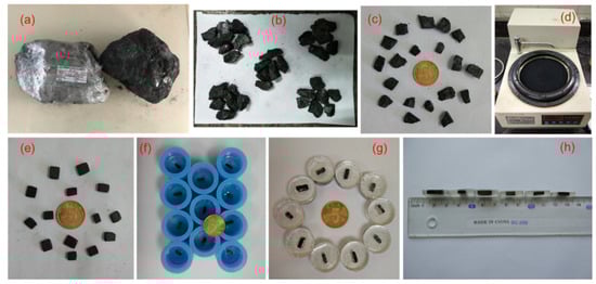 Figure 2. Process of sample preparation. (a) Block coal samples collected from the mine at one coal seam; (b) and (c) Irregular small coal samples obtained after breaking block coal sample; (d) YMP-1 grinding and polishing machine; (e) Regular small coal samples after polishing; (f) and (g) Small coal samples inlaid with epoxy resin and solidifying agent; (h) Regular small coal samples with 20 mm × 10 mm × 5 mm and evenly wrapped by the epoxy resin on both sides of the long side.
