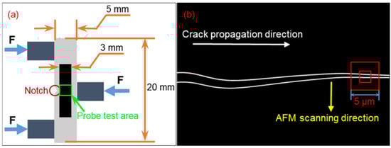 First, the prepared notch sample was placed in the three-point bending holder, 20 N preloading force was set to hold the sample, and conductive tape was used to connect the coal surface with the AFM sample stage. Then, the displacement loading mode was used in the three-point bending loading experiment, as shown in Figure 3a, at a loading rate of 0.05 mm/min. During the experiment, the dynamic process of microcrack propagation was captured by the optical imaging system of AFM. When the microcrack propagated stably, the loading was stopped to keep the load constant and to render the microcrack in a static state. Next, the microcracks were measured by AFM, and the scanning scales were 2 μm × 2 μm, 5 μm × 5 μm, and 10 μm × 10 μm. Figure 3b shows the diagram of the experimental scheme. In the experiment, five samples were prepared for the microdynamic loading test experiment.