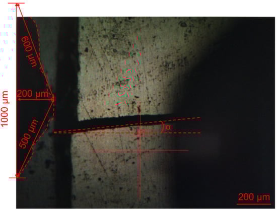 After counting the initiation position of the crack in 5 samples, it was found that the initiation position of microcracks appears at the notch tip in 4 samples, indicating that the notch plays a useful role in controlling the initiation position of microcracks, as shown in Figure 4. In Figure 4, the notch tip is the initiation position of the microcrack. The notch is shaped like a triangle, with three sides measuring 1000 μm, 600 μm and 500 μm in length. The angle of the initial microcrack propagation α is approximately 6°.