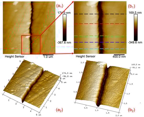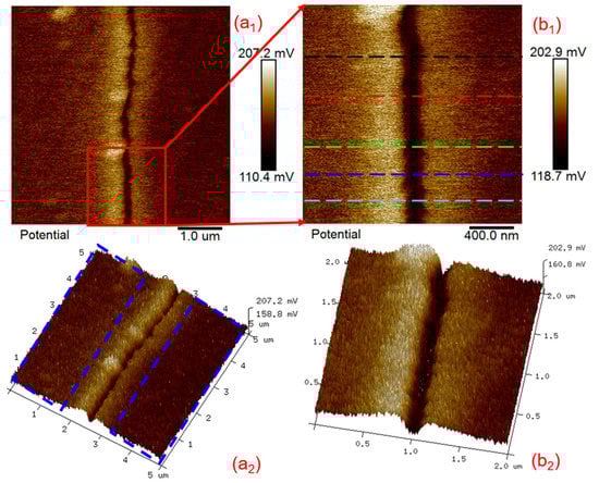 Figure 9(a1,a2) are 2D and 3D images of the surface potential distribution around the new microcracks, respectively, with a scale of 5 μm × 5 μm, Figure 9(b1,b2) are partial and enlarged views of Figure 9(a1,a2), respectively, with a scale of 2 μm × 2 μm. In the figure, bright colors represent higher surface potential, while dark colors represent lower surface potential. Therefore, it is clear that the surface potential at the microcrack edge is significantly higher than that at other locations far from the microcrack.