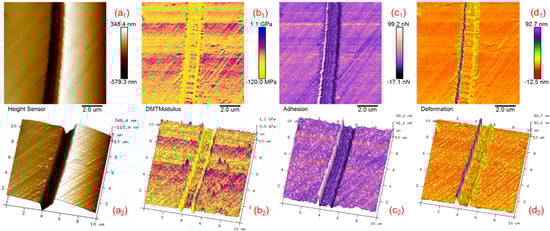 Figure 7. Characterization of micro mechanical properties: (a1) 2D surface morphology; (b1) 2D elastic modulus; (c1) 2D adhesion; (d1) 2D deformation; (a2) 3D surface morphology; (b2) 3D elastic modulus; (c2) 3D adhesion; (d2) 3D deformation.