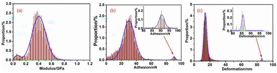 In addition, the fitting curve of the proportion for each parameter has two peaks, as shown in Figure 8. For the elastic modulus, the two peaks appear at 0.06 GPa and 0.40 GPa, representing the average elastic modulus at the microcrack edge and that around the microcrack, respectively. For the adhesion, the two peaks show at 30.29 nN and 90.64 nN, expressing the average adhesion around the microcrack and that at the microcrack edge, respectively. For the deformation, the two peaks exhibit at 14.14 nm and 85.67 nm, reflecting the average deformation around the microcrack and that at the microcrack edge, respectively. Interestingly, one peak is more dominant than the other. This is because the test data corresponding to the dominant peak are abundant, and their proportion is large, indicating the test data around the microcrack. The test data corresponding to the other peak are short, and its proportion is small, indicating the test data at the microcrack edge. The total amount of data is 65,536 (256 × 256).