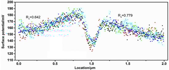 The cross-sectional data at the five dotted lines in Figure 9(b1) were extracted, and the surface potential cross-sections were plotted, as shown in Figure 11. The surface potential of the 0~0.75 μm segment on the left side of the microcrack and that of the 1.25 μm~2.0 μm segment on the right side of the microcrack on the blue cross-section are fitted separately, as shown in Figure 11. Two slope fitting straight lines are acquired, and the fitting degrees R2 are 0.642 and 0.779, respectively. These two fitting lines also clearly show that the surface potential of the 0~0.75 μm segment shows a gradually increasing trend with increasing distance and that of the 1.25 μm~2.0 μm segment shows a gradually decreasing trend with increasing distance. However, they have two characteristics in common. One is that the closer the material on the surface is to the crack, the higher the surface potential is, and the other is that the difference between the maximum and minimum surface potential values is approximately 25 mV.