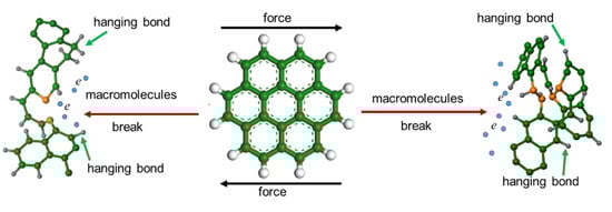 Figure 12. Schematic of fracture of coal macromolecules under external force with electron release and hanging bond formation.