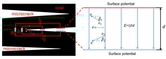 Coal can be regarded as the conductor of electricity, and many similar parallel-plate capacitors will be formed at the microcrack tip of coal during the fracture process [49], as shown in Figure 13. At the nanoscale, when the coal is broken, the bulges in the coal will be separated, and many nano similar parallel-plate capacitors will be formed between the bulges on the new microcrack tips. It is assumed that the area of the two opposite parallel plates of the similar parallel-plate capacitor is very small, less than 100 nm2, and the electric field between them is regarded as a uniform electric field. It can be obtained from this work that electrons are generated during coal fracture. These electrons can produce EMR when they move in a uniform electric field of the nano similar parallel-plate capacitor, according to Equations (6) and (7).