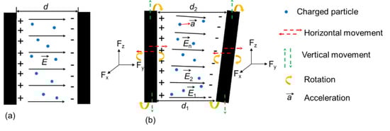Figure 14. Schematic of the electric field and interface movement between microelement interfaces in the coal mass. (a) Uniform electric field and (b) changing electric field.