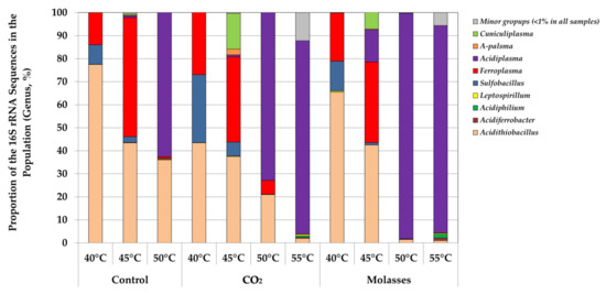 - Bulaev, A.; Boduen, A. Carbon sources as a factor determining the activity of microbial oxidation of sulfide concentrate at elevated temperature. Minerals 2022, 12, 110. [Google Scholar] [CrossRef]