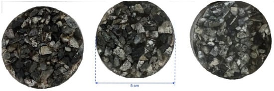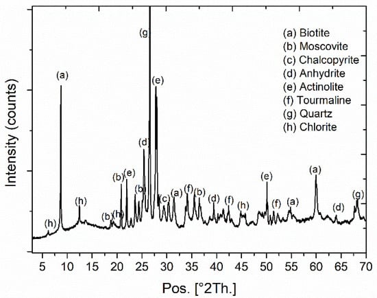 More than 55 samples from a mafic complex [20] were collected from a set of representative drill cores. Several sections having a 5 cm diameter are shown in Figure 1. They have predominant porphyry and interstitial textures, with contents of phenocrystals between 5% and 30%, and silica between 47.7% and 54.7%. The X-ray diffractogram, in Figure 2, shows the presence of quartz, biotite, tourmaline, chalcopyrite, and anhydrite.
