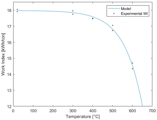 The value of the parameters obtained from the model were a = 754.4, b = 0.01078, and c = 13.96, with R2 = 0.9904. From this figure, it is possible to see that the energy is reduced even for temperatures up to 400 °C. Actually, the energy is reduced by 8% when the ore is heated to 400 °C, which is a considerable amount of energy reduction considering the total amount of energy used in the mining industry. Moreover, as seen in the figure, the pre-treatment has significant implications in terms of energy, since the energy required to process the mineral is reduced by 16% when the pre-treatment reaches a temperature of 600 °C.
