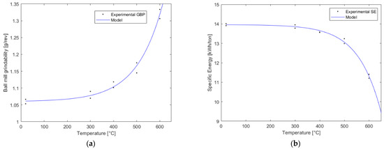 The energy needed to reduce the size of the mineral from an 80% passing size of F to an 80% passing size of P as a function of the pre-treatment temperature is shown in Figure 4b. In the same figure, a fitted model having the same structure given by Equation (3) is also displayed.