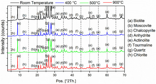 Figure 8 shows the diffractograms of the ore samples at room temperature and heated to 400, 500, and 900 °C. For comparison, the diffractograms are shown with a vertical displacement. As can be seen in the figure, no significant differences in the diffractograms of the respective samples were observed. The phases identified correspond to biotite (JCPDS card no. 042-0603), quartz (JCPDS card no. 046-1045), chalcopyrite (JCPDS card no. 035-0752), muscovite (JCPDS card no. 01-086-1368), anhydrite (JCPDS card no. 37-1496), actinolite (JCPDS card no. 01-080-0521), tourmaline (JCPDS card no. 011-0592), and chlorite (JCPDS card no. 002-0012). These results show that no phase transformations occur during the heating to 900 °C. However, a deeper analysis made by DSC showed some interesting results. Figure 9 shows the DSC curve for the mineral under study in the range from 20 to 600 °C.