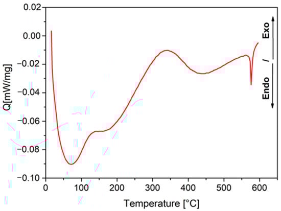 From Figure 9, it is possible to observe three main exothermic peaks after the initial endothermic hook. The first, at around 150 °C, is normally attributed to moisture loss. The second, located around 340 °C, has been explained as the decomposition of phases containing carbon and sulfur [25], in addition to hydroxides or nitrates [26]. In the studied mineral, and according to the literature, the exothermic peak between 300 and 400 °C can be attributed to changes in chalcopyrite, which, at around 360 °C, forms iron sulfate and results in the oxidation of sulfur [27]. In the same way, Carvalho et al. reported the crystalline modification of the anhydrite at around 380 °C [28], which cannot be excluded. Finally, the peak at around 570 °C can be associated with the silica leading to quartz inversion, which is normally reported at 573 °C [26].