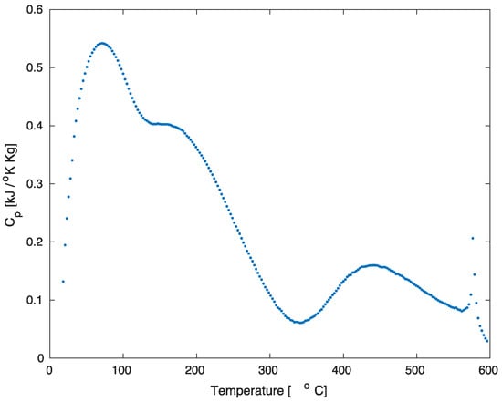 Using the DSC data depicted in Figure 9, the apparent specific heat capacity was calculated in terms of the temperature, as given in Figure 11. The estimation of the energy required to heat the sample was carried out by the numeral integration of using a trapezoidal method. The estimated value for the specific energy exchange by the sample is . This value is high compared to the work index of the mineral when no pre-treatment is applied (see Figure 3). Therefore, it is important to propose a system in which the investment in energy can be properly justified. This can be based on a solar pre-treatment since the mining industry in Chile is mostly located in areas where high rates of solar radiation are found.