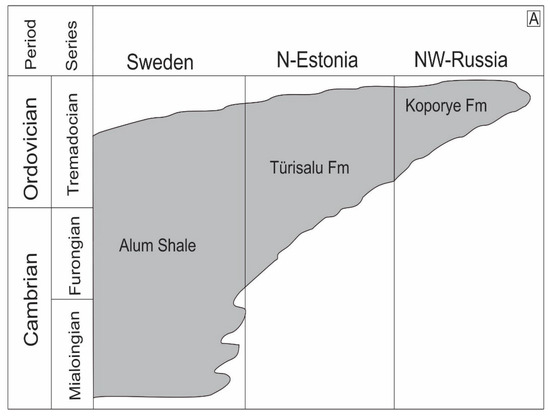 In the territory of Sweden, the black shale Formation belongs to the Middle Cambrian–Early Ordovician time interval [41]. This Formation is commonly called Alum Shale because historical raw materials for the production of alum were extracted from this shale.