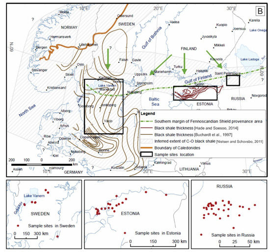 (A) Simplified stratigraphy of black shale in the Baltic Paleobasin after [21,37]. (B) Map of black shale areas showing sampling points after [24,38,39]. The green arrows represent possible directions of sediment provenance, while dotted green lines represent the southern Fennoscandian landmass between the middle Cambrian to middle Ordovician periods, constructed according to [40], regarding the tectonophysics for those periods. Question mark represents uncertainty in black shale distribution.