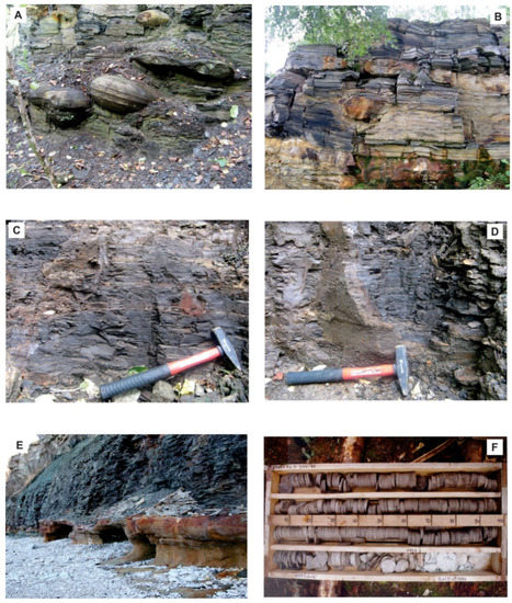 Representative outcrop and drill core photographs of the studied black shale. (A,B) Outcrops in Billingen and Kinnekulle, Sweden; (C,D) outcrops in western Russia; (E,F) outcrop in the Pakri Peninsula (NE Estonia) and drill core F344 (W Estonia), respectively.