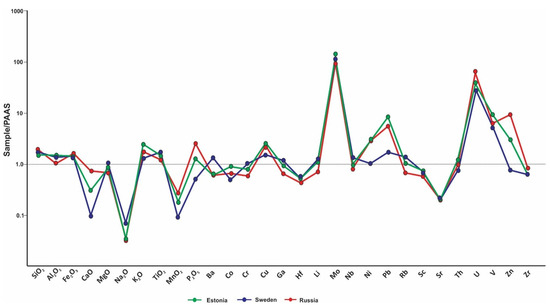 Major and trace element concentrations normalized against Post Archean Australian Shale [45]. The lines represent average elemental concentrations of drill cores from Estonia and Russia, and outcrops from Sweden.