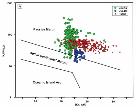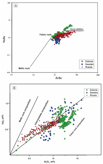 Due to the relatively immobile behavior of certain trace elements under surface weathering conditions, they can be transferred from parent rock to sediment without a significant gain or loss in concentration during processes leading to deposition [46]. Nevertheless, the fractionation and recycling of clastic material may affect provenance interpretations, which were made using immobile elements [46,47]. Nevertheless, immobile elements are extensively used for the characterization of the provenance of sedimentary rocks. Some trace elements such as La and Th are mostly concentrated in felsic rocks, whereas Sc, Cr and Ni are found more frequently in basic rocks [48]; therefore, their ratios can provide information about the possible sediment sources for deposited sediments. The Th/Sc versus Zr/Sc plot (Figure 4A) was used to infer the provenance of the black shale in Sweden, Estonia, and Russia [46]. The samples from the Sweden plot in the felsic field suggest that felsic rock may be the dominating source of the sediments. Samples from Estonia and Russia plot also contain felsic rock, but they exhibit a trend in the direction of Zr addition. This may indicate that the provenance of samples from Estonia and Russia is composed of a mix of felsic rocks and recycled sediments. This interpretation is corroborated by the relatively higher ratios of Zr/Sc and K2O/Na2O in Russian and Estonian samples (respective average values 23 and 13 for Zr/Sc and 48 and 77 for K2O/Na2O).