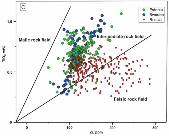 The interpretation of the Zr versus TiO2 plot [2] also agrees with a felsic to intermediate provenance for the black shale (Figure 4C). In this plot, samples from Sweden and Estonia fall almost entirely in the intermediate rock field (except for six samples in the felsic rock field). Samples from Russia, however, plot in both intermediate and felsic provenance fields.