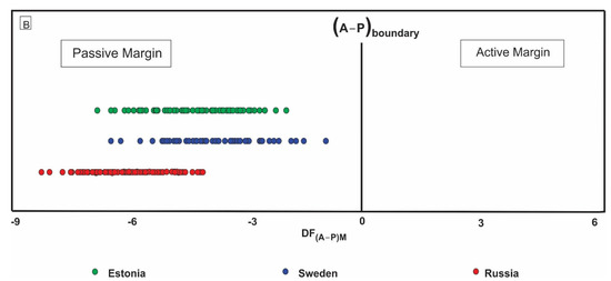 A new method of discriminating tectonic settings proposed by Verma and Armstrong-Altrin [7] is also employed in this study to infer the tectonic setting of the Baltoscandian black shales (Figure 5B). This method uses either major element (SiO2 to P2O5) data only, or a combination of major and trace elements (Cr, Nb, Ni, V, Y and Zr) with the application of the computer software “APMdisc”. It has been demonstrated that this approach may have great success in accurately discriminating active and passive margin tectonic settings [7,56,57]. In this paper, major element data of the black shale samples were used to infer the tectonic settings of the studied sites. The samples plot in the passive margin field of this discriminant (with over 99% confidence rate for all samples), suggesting a passive margin setting for the Baltoscandian black shales (Figure 5B). This interpretation agrees well with an earlier interpretation based on the Roser and Korsch [3] discriminant model and with general knowledge of Baltoscandian geotectonic settings during the Lower Paleozoic era [30].