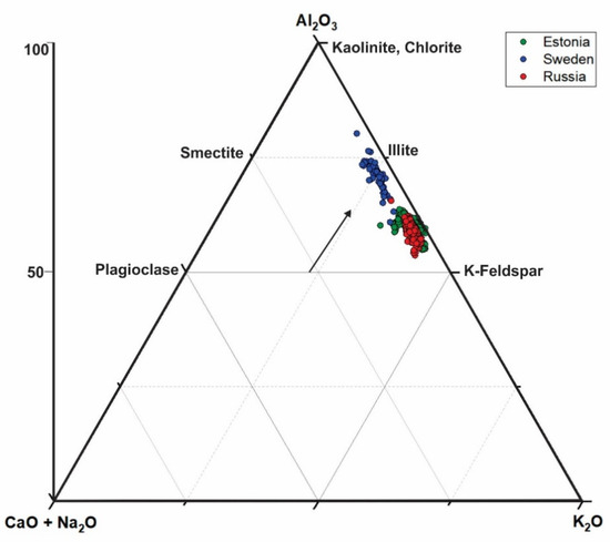 On the geochemical ternary plot (Figure 6), the samples show a trend along the Al2O3–K2O compositional line, which represents an advanced stage of weathering. Samples from Russia and Estonia cluster just above the K-feldspar region, whereas samples from Sweden cluster around illite.