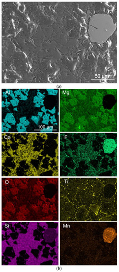 Figure 6a shows the BSE image of a smaller area in Figure 5, and Figure 6b shows EDX mapping of this area. The element distribution in Figure 6b corresponds to that in Figure 4b as angular spinel crystals embedded in the Al-Mg-Ca-F-Si-Ti-Mn-Fe-K-Na-O oxy-fluoride glass phase matrix, with small phase areas of Al-Mg-Si-Ti-Mn-O phase exsolved upon cooling. Titanium is distributed across all phases, with higher concentrations at the edges of the large spinel crystals and as points inside the exsolved Al-Mg-Si-Ti-Mn-O phase areas. The spinel crystals are typically of 25 µm in cross-sectional dimension.