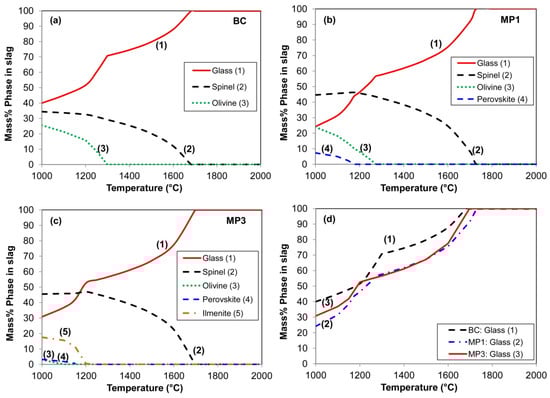 The solidification curves in Figure 7a–d are in general agreement with the reported high-temperature-phase chemistry in this flux system, namely, the presence of a liquid slag phase and solid spinel crystallites [9,10]. The solidification curve calculations predict that the flux mixture was completely liquid at the weld pool temperature reported in the literature, 2000 °C [7,8]. Upon cooling, spinel precipitated as the primary solidification phase. Due to the increased alumina content in the modified MP1 and MP3 slags, the percentage spinel phase is increased to double that of the BC slag at 1400 °C. Clearly the increased alumina content in the MP1 and MP3 slags would significantly increase the two-phase slag viscosity, compared with the unaltered BC slag viscosity [9,45]. As indicated before, due to the exponential increase in slag viscosity with increased solid phase proportion, even slight increases in the proportion of spinel phase in the slag result in a drastic increase in slag viscosity [10]. Slag viscosity is double that of the CaF2 matrix phase with every 10 mass% increase in solid phase [46]. Figure 7d shows the liquid glass curves from Figure 7a–c for easier comparisons. The curves illustrate that although the slag liquidus temperatures are similar at 1682 °C, 1730 °C and 1670 °C, the precipitation phase formation sequence sets these slags apart. For example, at 1400 °C the BC slag contains 25% spinel phase, compared with 38–39% spinel in the MP1 and MP3 slag. Increased spinel content in the MP1 and MP3 slags is due to the higher quantity of Al2O3 present in the MP1 and MP3 slags, in combination with fewer glass matrix formation compounds of SiO2 and MnO from aluminothermic reduction of the slag. Furthermore, it appears that at the lower temperatures close to 1000 °C, the higher TiO2 in MP3 slag somewhat compensates for the increased spinel phase formation due to higher %Al2O3 and lower %SiO2 and %CaF2 contained, as compared with the MP1 slag.