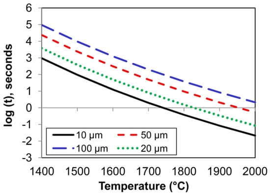 As pointed out above, the spinel phase grows from oxide slag according to the parabolic rate law at higher temperatures, in the order of 1400 °C [10,47]. Figure 8 shows the growth rate relationship reported in the literature applied here to calculate the time required for a spinel crystal to grow to a specific size at different temperatures. At 1700 °C, close to the liquidus temperatures of slags BC, MP1 and MP3, the rate equation predicts that a 10 μm spinel crystal can crystallise and grow from the molten glass phase in 2.0 s and a 20 μm crystal in 7.9 s. The BC weld metal solidification time was calculated to be about four seconds, using the weld ripple lag distance and travel speed [32,33]. In comparison, the typical spinel crystal sizes observed in the BSE images of Figure 2, Figure 4 and Figure 6 are 20 μm, 40 μm and 25 μm in the BC, MP1 and MP3 slags, respectively. These observations are in agreement with the formation of the larger spinel crystals observed in MP1 slag (40 μm) from the enhanced process whereby Al2O3 is formed in aluminothermic reduction, and not only from spinel formation from the matrix glass phase.
