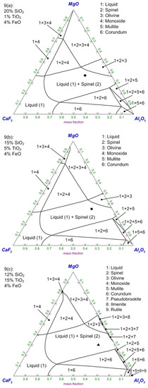 (a–c) CaF2-SiO2-Al2O3-MgO-TiO2-FeO pseudo-ternary phase diagrams for 1400 °C, as calculated in FactSage 7.3 [40,41].