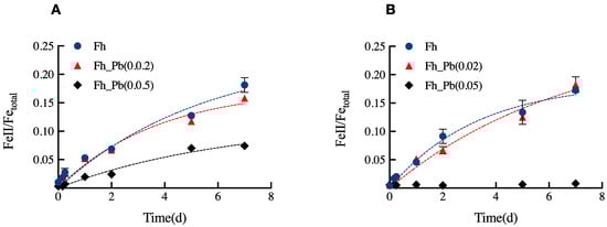3.2. Bioreduction of the Fh_Pb Series and Concentrations in Solution