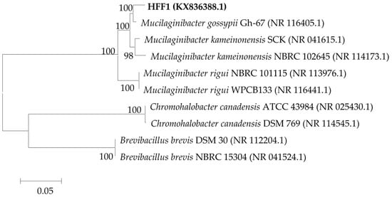 Chromosomal DNA was extracted from the HFF1 bacteria using a cetyltrimethylammonium bromide (CTAB) method. The PCR products were then analyzed, via agarose gel electrophoresis, and the brightest DNA fragment in the gel, about 1500 bp in length, was selected to determine its sequence by Sangon Biotech (Shanghai Co, Ltd., Shanghai, China). A nucleotide homology comparison was carried out using the basic local alignment search tool (BLAST) in GenBank. By comparing a certain number of 16S rDNA sequences from different bacteria, the phylogenetic tree of HFF1 was constructed using a neighbor-joining method in MEGA (Version 6, The Pennsylvania State University, Philadelphia, PA, USA) (Figure 1). Physiological and biochemical characteristics of HFF1 were examined. The morphological characteristics of HFF1 bacterial cells were observed, using a high-resolution transmission electron microscope (HRTEM, JEM-2100, Japan Electronics Company (JEOL), Toyko, Japan).
