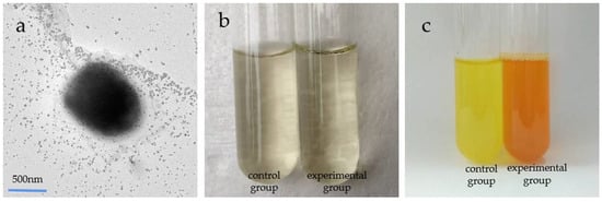 The HRTEM image shows that a single HFF1 bacterium is short and rod-shaped, approximately 1.3–1.8 μm in length and 0.7–1.0 μm in width (Figure 2a), and the apparent EPS around the cell surface is also observed. Ammonia production is corroborated in the experimental group, as shown in Figure 2. Before the addition of Nessler reagent, the control group is clear and transparent, while the experimental group is slightly turbid, due to the existence of bacterial HFF1 (Figure 2b); after the addition of Nessler reagent, the color of the experimental group becomes brownish red, while the color of the control group is yellow (Figure 2c), indicating that HFF1 produces NH3 through its metabolism.