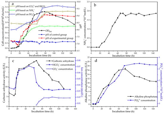 The bacterial growth of the incubation medium was determined using a spectrophotometer (UNIC7200, Shanghai Sainty Hengfeng Scientific Instrument Co. Ltd., Shanghai, China), at a wavelength of 600 nm, and pH was determined with a pH meter (PHS-3E, Jiangfen Electrical Analysis Instrument Co. Ltd., Taizhou, China). The qualitative determination of ammonia was performed using Nessler’ reagent spectrophotometry, and the quantitative measurement of NH4+ concentration was also conducted using the international standard test method [11]. CA activity and concentrations of carbonate and bicarbonate were measured according to the references [11,31]. The alkaline phosphatase (ALP) activity, total phosphate concentration, and pH based on the phosphate were measured [31]. The total phosphate concentrations were also determined using the molybdenum blue method, according to the previous study [31]. The pH based on the phosphate content was also measured: the solutions of the same molar concentrations of phosphate were prepared by dissolving the sodium phosphate into the distilled water, and then the pH values of the solutions were measured using a pH meter.