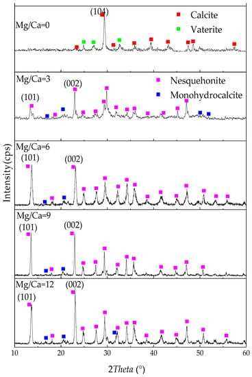 The stock solutions of MgSO4·7H2O (2 mol·L−1) and CaCl2 (1 mol·L−1) were separately added into the liquid culture medium to keep the Ca2+ concentration at 0.01 M, and the Mg2+ concentration at 0, 0.03, 0.06, 0.09, and 0.12 M. The pH was also adjusted to 7.2. Therefore, the Mg/Ca molar ratios are 0, 3, 6, 9, and 12 (Table S1). The incubation medium of bacteria HFF1 (OD600 = 0.8) was inoculated into the culture medium at different Mg/Ca molar ratios (0, 3, 6, 9, and 12), with 1% inoculation volume in the experimental groups; the control groups were made by replacing the incubation medium with the same volume of distilled water. Then, these cultures were incubated in a shaking incubator (DHP-9050B, Shanghai Langgan Laboratory Equipment Co., Ltd., Shanghai, China) at 30 °C for 13 days. All experiments were carried out in triplicates.