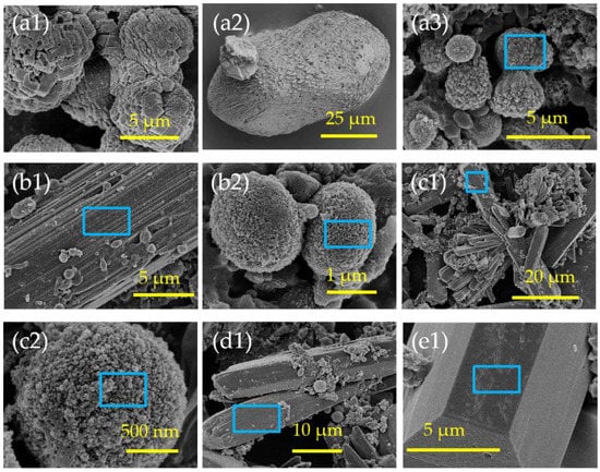 SEM of minerals in the experimental groups (a1–a3: at Mg/Ca molar ratio of 0; b1,b2: at Mg/Ca molar ratio of 3; c1,c2: at Mg/Ca molar ratio of 6; d1: at Mg/Ca molar ratio of 9; e1: at Mg/Ca molar ratio of 12).