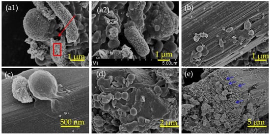 Besides the dumbbell-shaped minerals with a porous, rough surface (Figure 5b2), at a Mg/Ca molar ratio of 3, there are also prismatic minerals attached with bacterial cells (Figure 5b1). The prismatic minerals with smooth surfaces are also observed, in addition to the spherical and irregular minerals at Mg/Ca molar ratios of 6, 9, and 12 (Figure 5c1–e1). Hollow, short, rod-shaped shells appear at a Mg/Ca ratio of 0 (Figure 6a1,a2). However, the shells do not appear in the culture medium at Mg/Ca molar ratios of 3, 6, 9, and 12, which may be due to the calcite dissolution in the presence of Mg2+. In addition, bacterial cells (Figure 6b–e) are observed on the mineral surface; some surrounded with EPS are also clearly observed (Figure 6c).