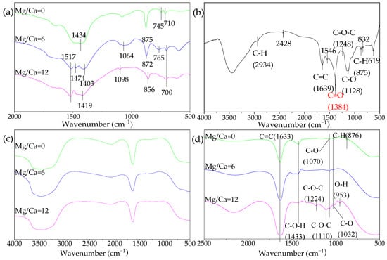 The peaks at 710 and 875 cm−1 are the characteristic peaks of calcite, and peaks at 745 and 1434 cm−1 indicate the presence of vaterite at a Mg/Ca ratio of 0 (Figure 7a), consistent with the mineral phases of the XRD result (Figure 4). Similarly, for the mineral phases at Mg/Ca molar ratios of 6 and 12, the results are also consistent with the XRD results [31,72]. FTIR results of EPS are also obtained (Figure 7b): many kinds of organic functional groups such as C-H, C=C, C-O-C, and C=O are present [10,31,73]. Moreover, the infrared spectra of supernatant of minerals after vibration in an ultrasonic vibrator are almost identical to that of distilled water (Figure 7c) [31], which indicates that organic functional groups on the mineral surface are washed away completely. The FTIR patterns of organic substances within the minerals (Figure 7d) show that the peaks at C-H (876 cm−1), C-O (1032, 1070 cm−1), C-O-H (1433 cm−1), and C=C (1633 cm−1) are detected inside minerals. Additionally, a band of C-O-C (1110, 1224 cm−1) is also shown at a Mg/Ca ratio of 12 [74]. These results confirm that the organic functional groups are embedded in the minerals. It is noteworthy that many organic functional groups within the minerals (Figure 7d) are also detected in EPS (Figure 7b), which demonstrates that organic substances may play an important role in the formation process of biotic minerals.