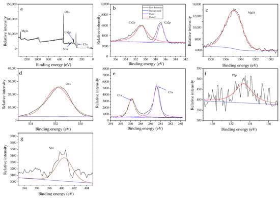 XPS analysis is conducted in order to determine the relationship between organic substances and the biomineral. The XPS patterns show the existence of Mg, Ca, C, O, P, and N on the biomineral surface (Figure 8a). As shown in the XPS Ca2p spectrum (Figure 8b), the peaks at 350.1 and 346.9 eV are attributed to the presence of Ca2+ ions [31]. The magnesium peak (Mg1s) at 1304.9 eV represents the presence of magnesium (Figure 8c) [75]. The oxygen at bonding energy of 531.7 eV (Figure 8d) suggests that the oxygen makes a double bond with carbon (O=C) in carboxylic acid, carboxylate, ester, carbonyl, or amide [76]. Carbon peaks (C1s) are decomposed into two components (Figure 8e): the first is due to the carboxylic functions at 289.8 eV, and the second peak is attributed to the carbon bond with carbon and hydrogen (C-C, C-H) at a bonding energy of 284.8 eV [76]. Phosphorus is clearly observed at a bonding energy of 133.5 eV (Figure 8f), which indicates the presence of phosphate [76]. Nitrogen is found at 400.05 eV (Figure 8g), due to the unprotonated amine or amide functions [31,76]. These functional groups are adsorbed on the minerals or embedded in minerals, which demonstrates that organic substances may play a necessary role in the biomineralization process.