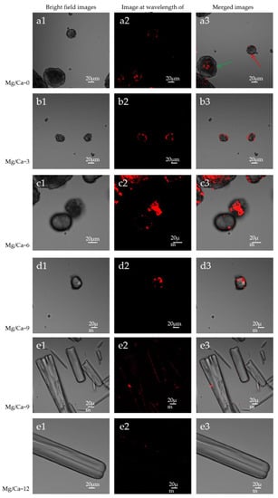 Red fluorescence of amino acid is observed at the edge of crystals of the experimental groups at various Mg/Ca ratios (Figure 9), indicating the distribution of amino acids within the crystals. For the smaller spherical crystals, the fluorescence intensity at the edge of crystals is much higher than that at the center of the crystals (Figure 9a3 red arrow); however, the fluorescence accumulates in the interior of the larger spherical crystals (Figure 9a3 green arrow), which may be due to the effect of sample thickness and geometry.