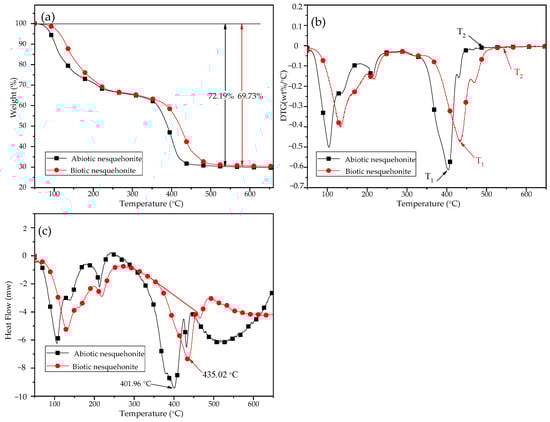 It can be seen from Figure 10 that the thermal decomposition process of nesquehonite, at a rate of 5 °C per minute, is divided into two stages. In the first stage (dehydration stage), for the abiotic nesquehonite crystal (MgCO3·3H2O) with three water molecules with different combining abilities, two of the crystal water molecules are lost at a lower temperature (initial to 182 °C), and the third water molecule is removed at a higher temperature (182–293 °C) (Figure 10a). In the second stage, the decomposition process of MgCO3 occurs (Equation (2)). The total mass losses in the dehydration stage and decarbonation stage are 72.19 wt %, which is nearly equal to the theoretical value (68.12 wt %). However, for the biotic nesquehonite, the corresponding thermal temperatures are always higher than those for abiotic nesquehonite, and the total mass loss in the dehydration stage and decarbonation stage is 69.72 wt % (Figure 10c).