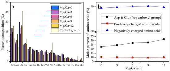 M. gossypii HFF1 cultivated in the medium with various Mg/Ca ratios, and without Mg2+ and Ca2+ ions, were collected, and then the EPS were obtained using the reported method [21,45]. Then, the amino acid composition of EPS was analyzed using an amino acid analyzer (L-8900, Hitachi, Tokyo, Japan). FTIR analyses of EPS powder were also conducted [31].