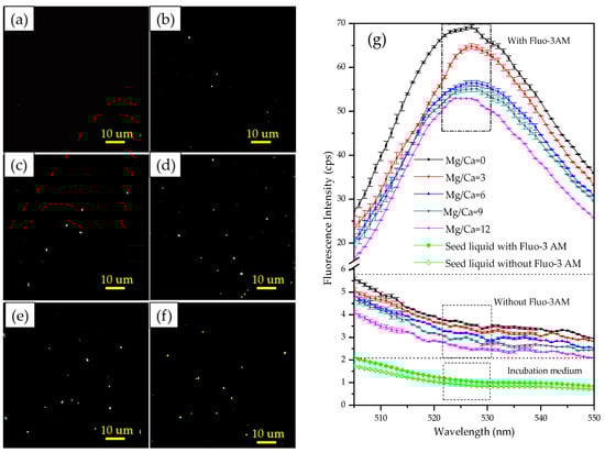 To explore intracellular biomineralization, HFF1 bacteria were stained with Fluo-3-AM (Dojindo Laboratories, Kumamoto, Japan), and then analyzed using a confocal laser scanning microscope (CLSM, Fluo ViewTM FV1000, Olympus Corporation, Tokyo, Japan). In order to distinguish the fluorescence released from Ca2+ ions and bacterium itself, strain HFF1 cultivated in the incubation medium without Ca2+ ions was also analyzed. Before observation, the samples of the experimental groups after 21 days of incubation (various Mg/Ca molar ratios of 0, 3, 6, 9, and 12), and the incubation medium cells, were prepared, according to the method described in the previous article [68]. Then, M. gossypii HFF1 cells were observed with the CLSM at a fluorescence wavelength of 580 nm. The fluorescence intensity of cells at various Mg/Ca ratios and incubation medium were also measured quantitatively, using a fluorescence spectrophotometer (Hitachi F-4600, Hitachi, Japan). The excitation wavelength was 480 nm, and the emission wavelength was set between 490 and 550 nm. Cells stained with Fluo-3AM were set as experimental groups, while cells stained without Fluo-3 AM were set as control groups. The incubation medium cells with and without the staining of Fluo-3 AM were also measured quantitatively with the same method.